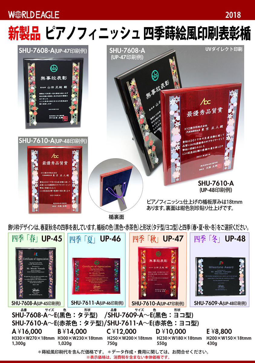 ピアノフィニッシュ仕上げ(光沢塗装)の高級感を活かし、四季(春夏秋冬)のイメージを蒔絵風に表現した表彰楯です。