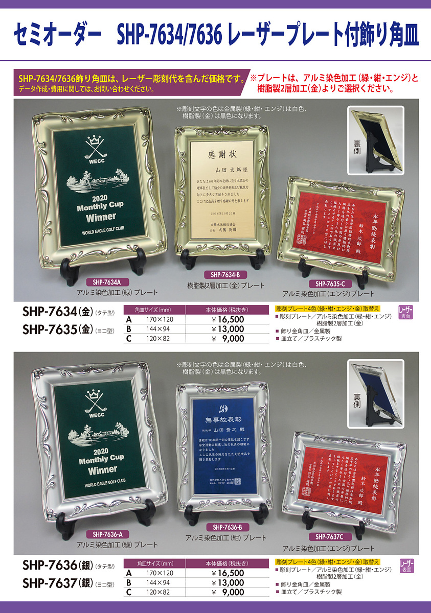 金属製飾り角皿(金色仕上/銀色仕上)に、アルミもしくは樹脂製2層金色プレートを取り付け、表彰文字を際立たせた表彰楯です。